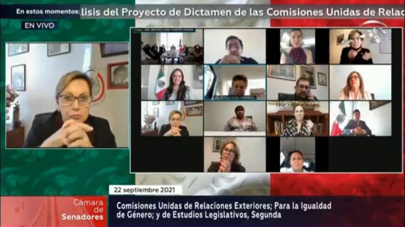 Durante la sesión virtual de las tres comisiones a la que asistieron funcionarios de la Secretaría de Relaciones Exteriores (SRE), los legisladores manifiestan en su iniciativa, que el actual Gobierno federal ha planteado como uno de sus ejes fundamentales en materia de política exterior, la Política Exterior Feminista de México (PEF).