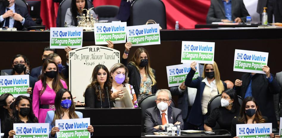 Por parte del PAN, diputados de la bancada blanquiazul se manifestaron con pancartas reclamando: ¡”Que vuelva el Seguro Popular”! Y también le restregaron una lápida para que escribiera su epitafio.